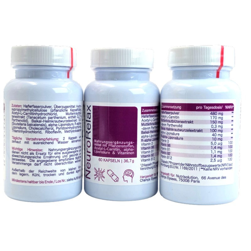 NeuroRelax ist ein hochwertiges Nahrungsergänzungsmittel auf pflanzlicher Basis mit Haferfaserpulver, Acetyl-L-Carnitin, Alpha-Liponsäure sowie ausgewählten B-Vitaminen. Die sorgfältig abgestimmte Kombination unterstützt den normalen Energiestoffwechsel und trägt zur normalen Funktion des Nervensystems bei.