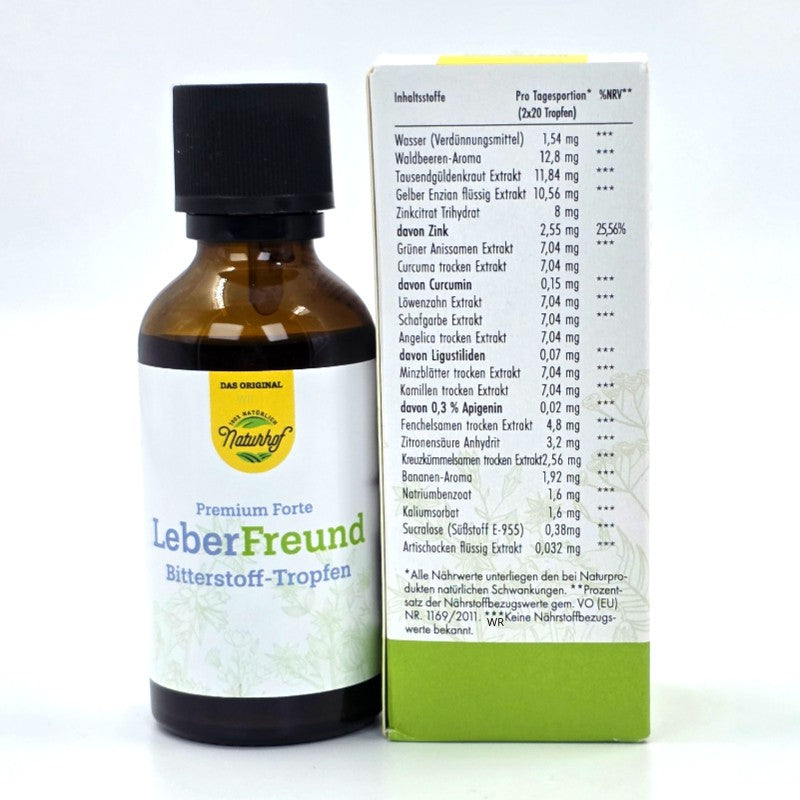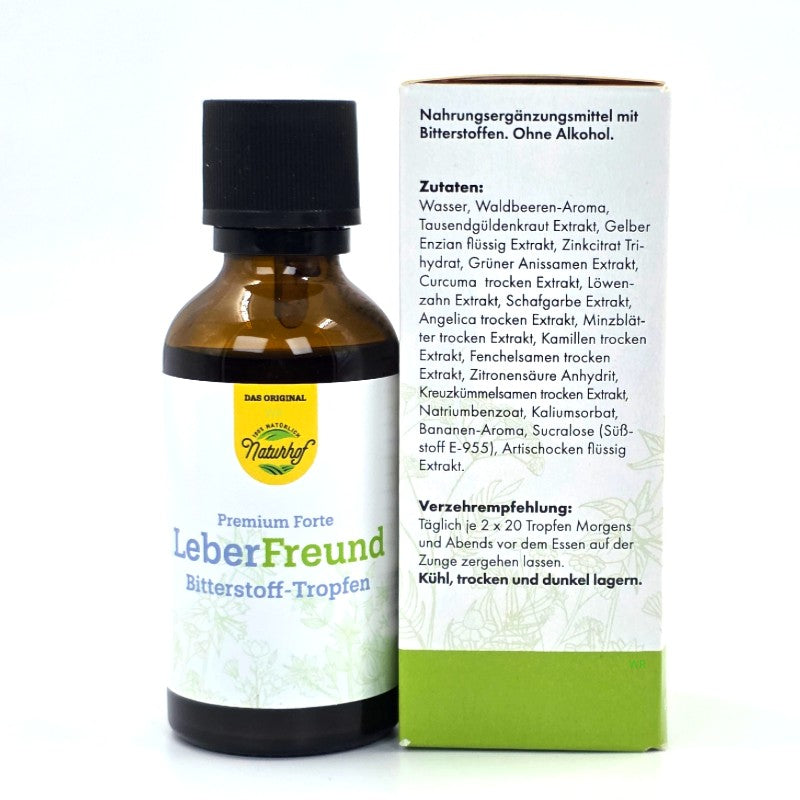 Die Leber Freund Bitterstoff-Tropfen sind ein hochwertiges, alkoholfreies Nahrungsergänzungsmittel mit wertvoller Kräuterkomposition und fruchtigem Waldbeer-Aroma. Ideal nach dem Essen – als sanfte Alternative zu Espresso oder Schnaps. Die Tropfen enthalten zwölf ausgewählte Naturkräuter und Pflanzenextrakte, die helfen können, das Wohlbefinden zu fördern und die Leber sowie Verdauung zu unterstützen.